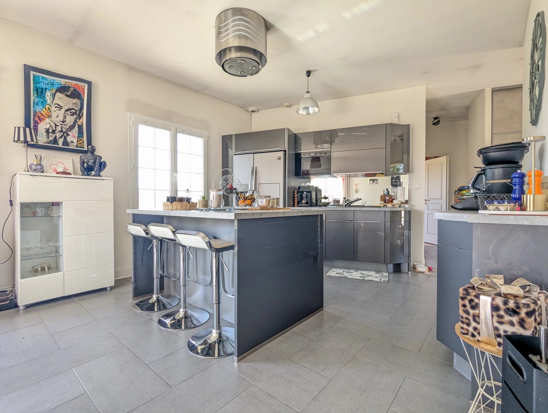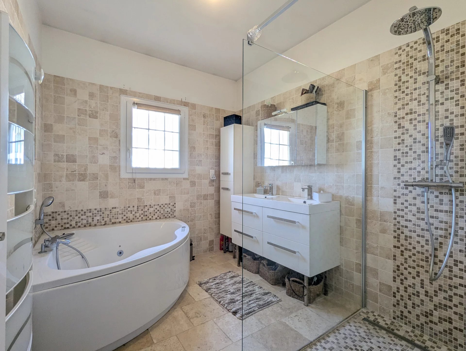 Au rez-de-chaussée: une entrée avec placard / penderie, une pièce de vie lumineuse d'environ 40 m² avec une cheminée insert, cuisine entièrement aménagée et équipée, 2 chambres dont une de 15 m² avec placard, une belle salle de bains mixte (baignoire et douche), un buanderie et un wc indépendant.