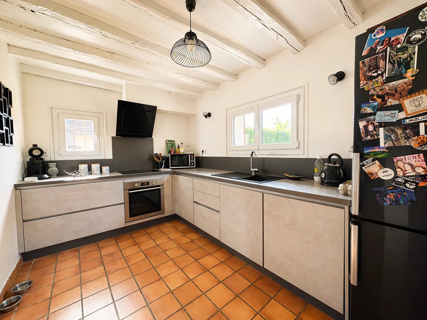 Au rez-de-chaussée, vous trouverez une suite parentale avec salle de douche, une buanderie, un WC avec lave-mains, ainsi qu’une belle pièce de vie composée d’un salon, d’une salle à manger et d’une cuisine ouverte aménagée et équipée. L’ensemble est chaleureux avec ses poutres apparentes et son poêle à granulés.