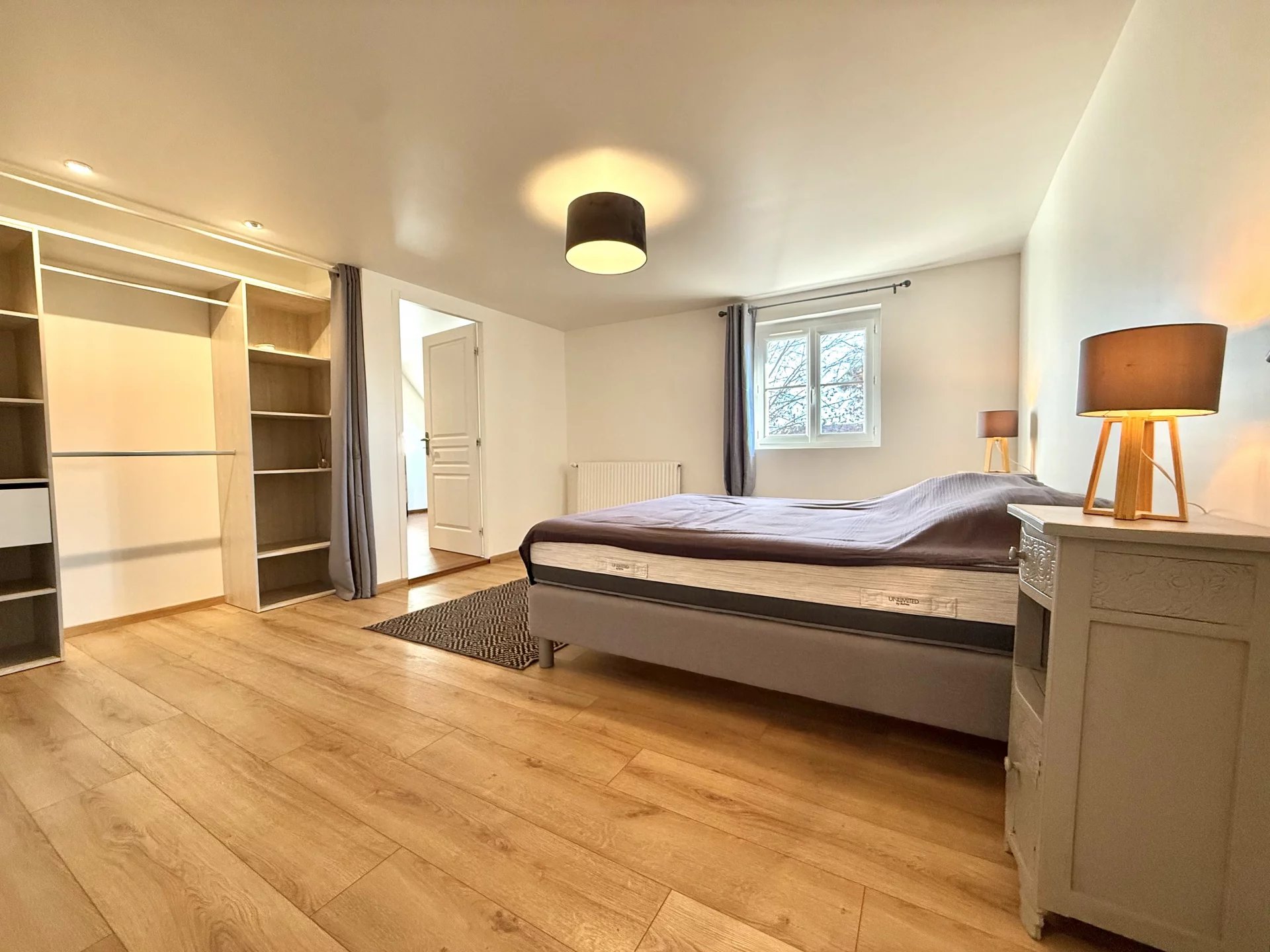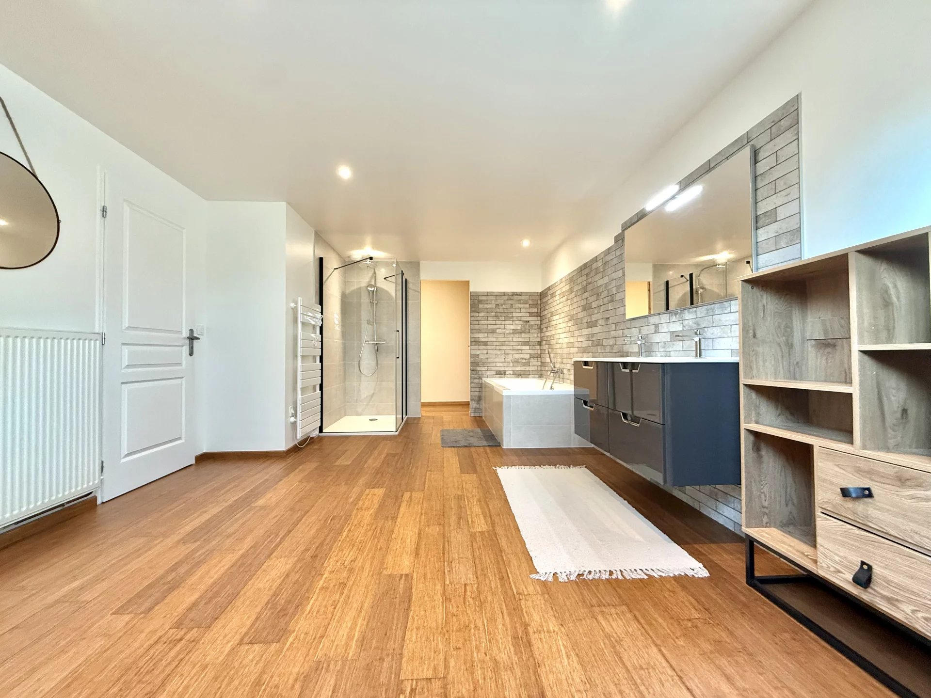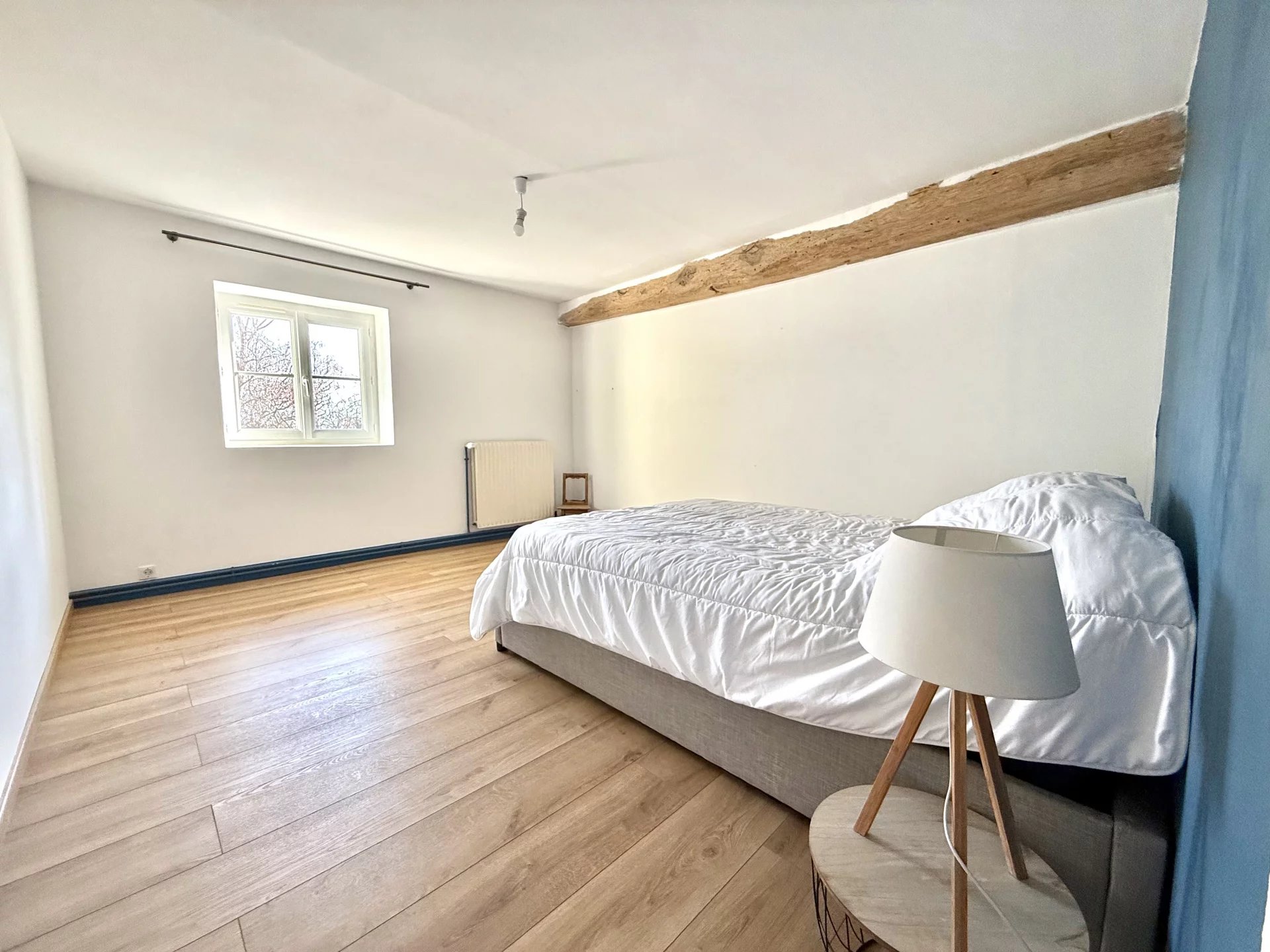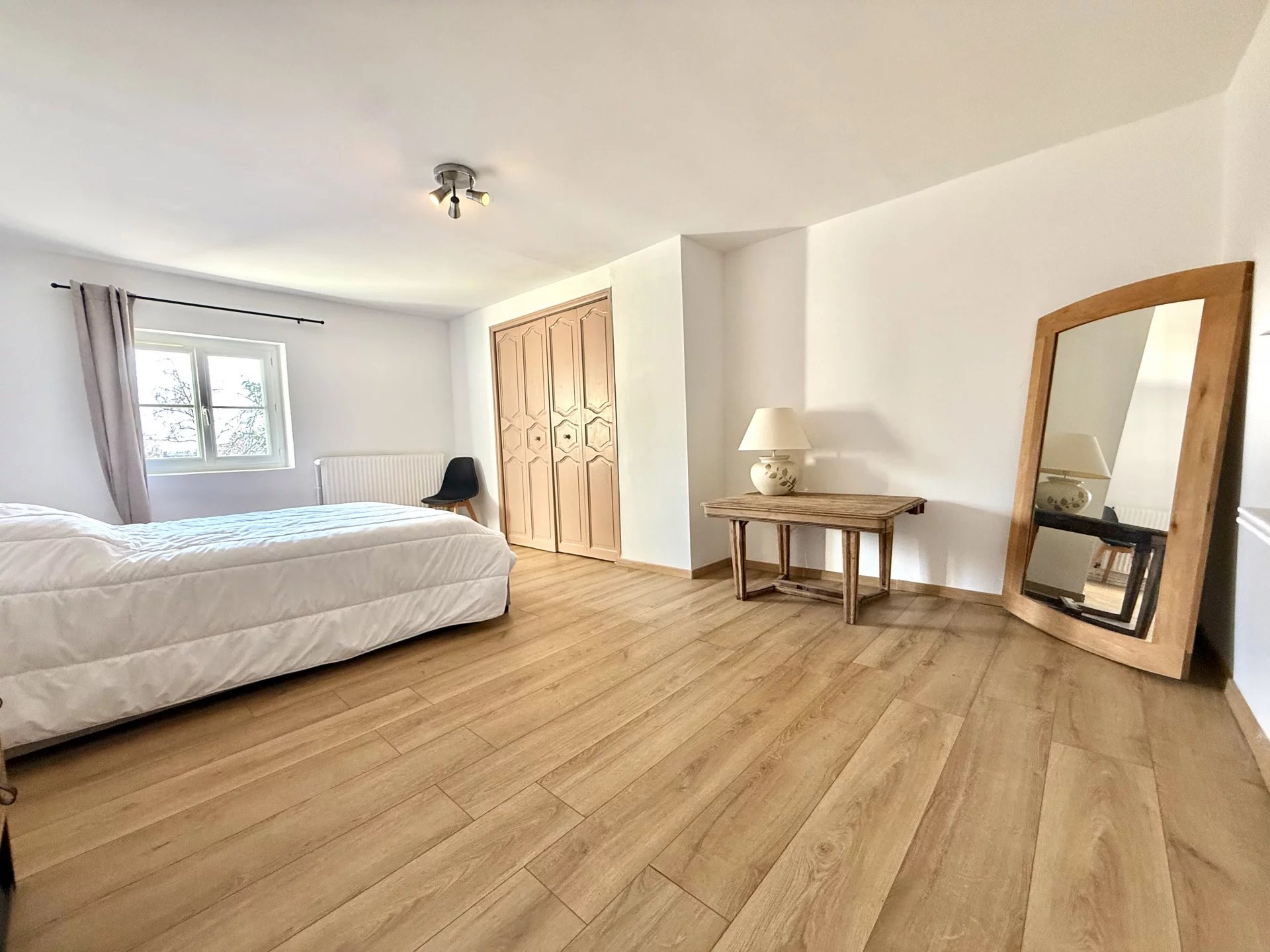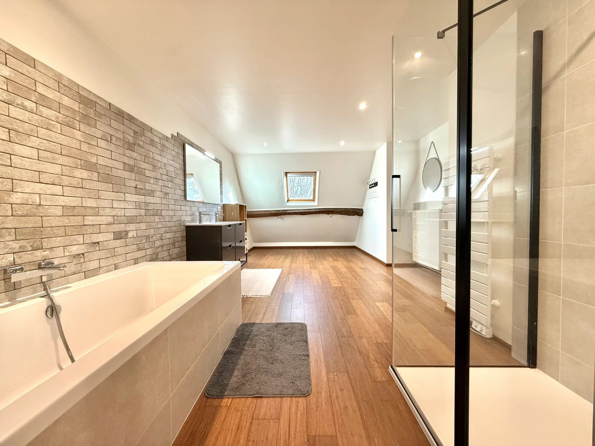 - À l'étage : un couloir desservant quatre belles chambres, une grande salle de bains mixte (baignoire et douche) et un wc.