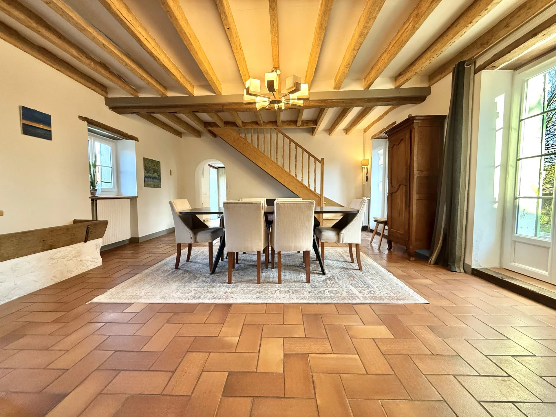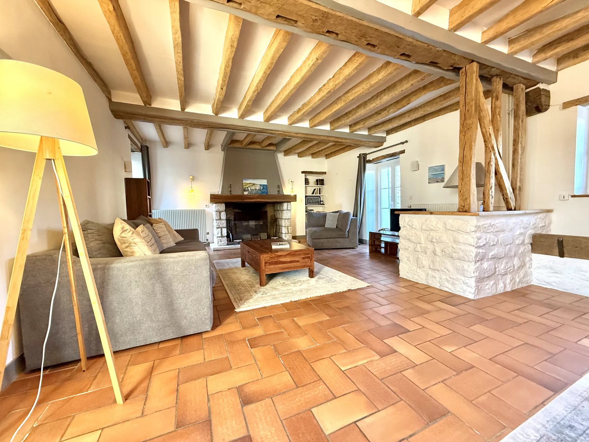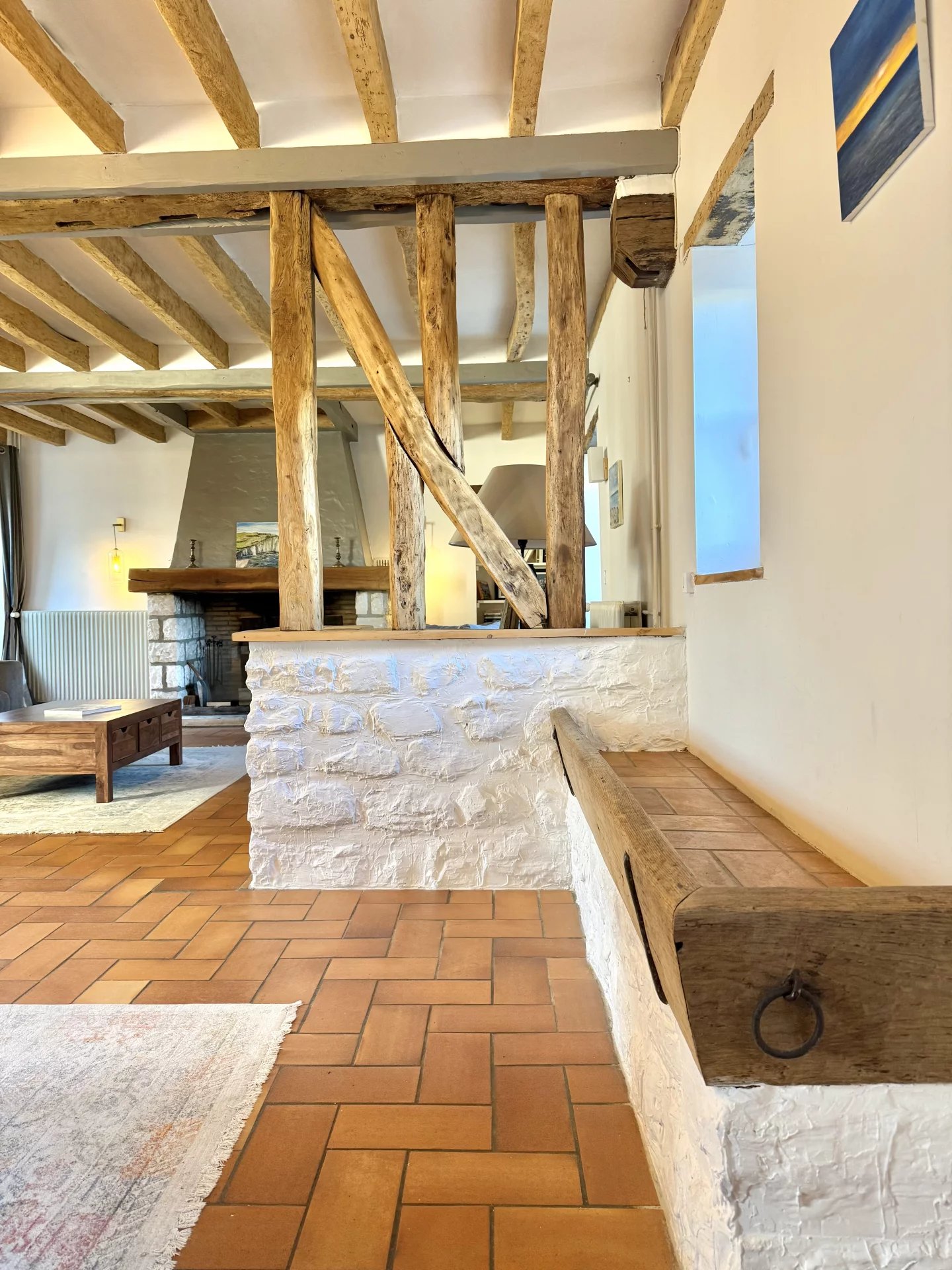 - Au rez-de-chaussée : un double séjour de 50 m² avec cheminée ouverte et porte fenêtre donnant sur une belle terrasse, une cuisine entièrement aménagée et équipée, une pièce pouvant être aménagée en chambre, une salle de douches toute neuve et un wc indépendant.