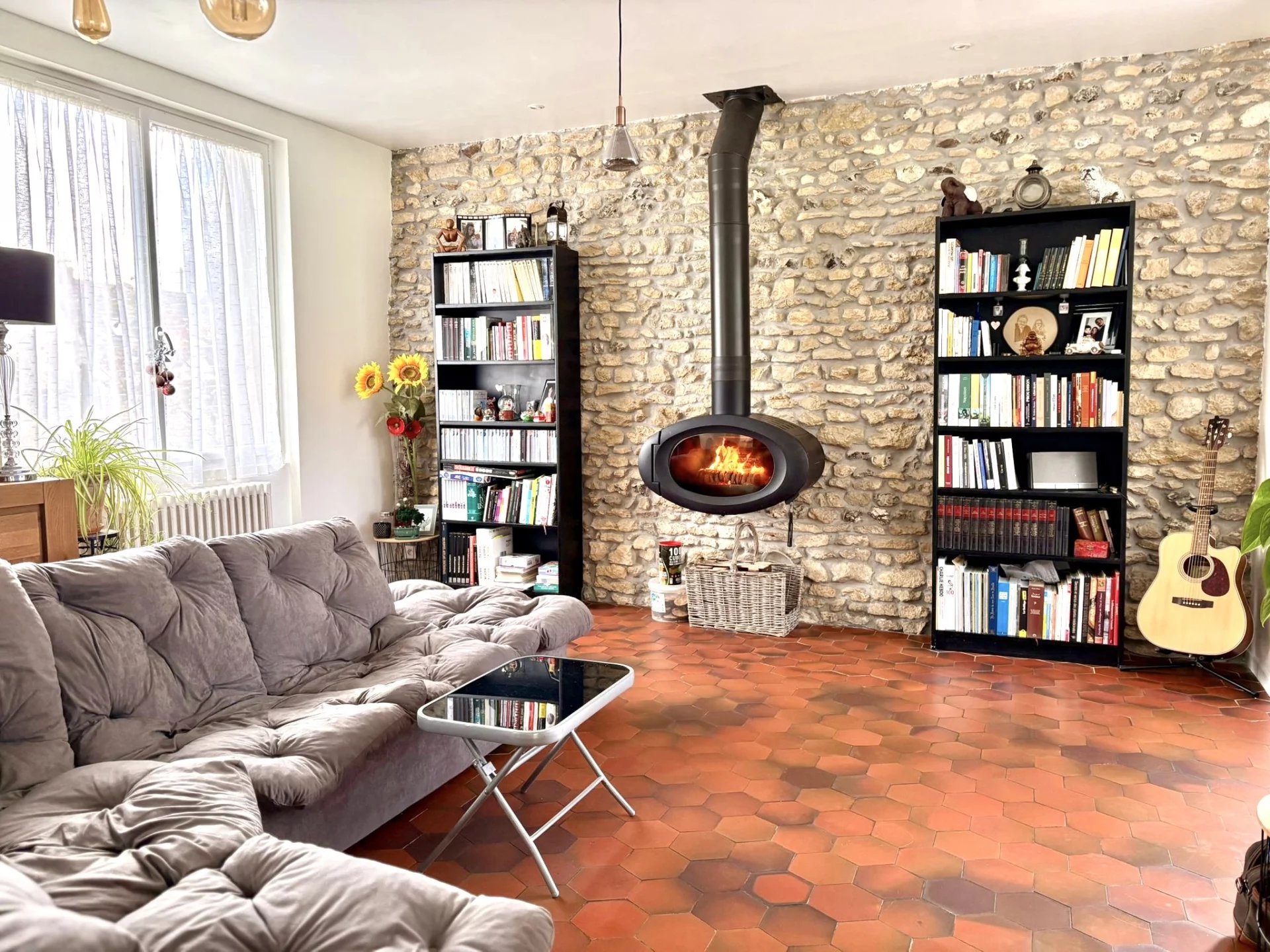 Au rez-de-chaussée : une vaste pièce de vie lumineuse avec poêle à bois, une cuisine indépendante avec accès direct au jardin ainsi qu’un WC.